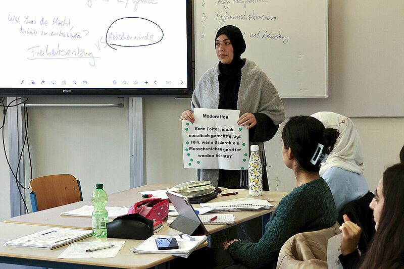 Heute sind Nadia Tabibzada (17) und Sina Bomm (17) die christlichen Geistlichen. Andere aus dem Religionskurs der 12. Klasse am Hamburger Kurt Körber Gymnasium übernehmen die Rollen islamischer Geistlicher, Menschenrechtler oder Polizisten. Zur Diskussion steht die Frage, ob Folter moralisch gerechtfertigt ist, wenn dadurch Menschenleben gerettet werden können.