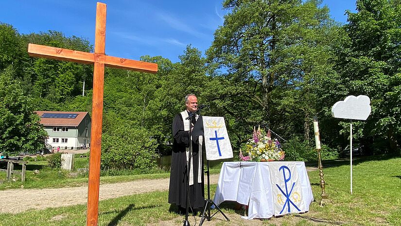 Im Müritz-Nationalpark predigte Bischof Tilman Jeremias zu Christi Himmelfahrt im Gottesdienst der Kirchengemeinde Wanzka. Mehr als 200 Menschen waren in Steinmühle (Landkreis Mecklenburgische Seenplatte) am Ufer des Grünower Sees beim Open-Air-Gottesdienst dabei.