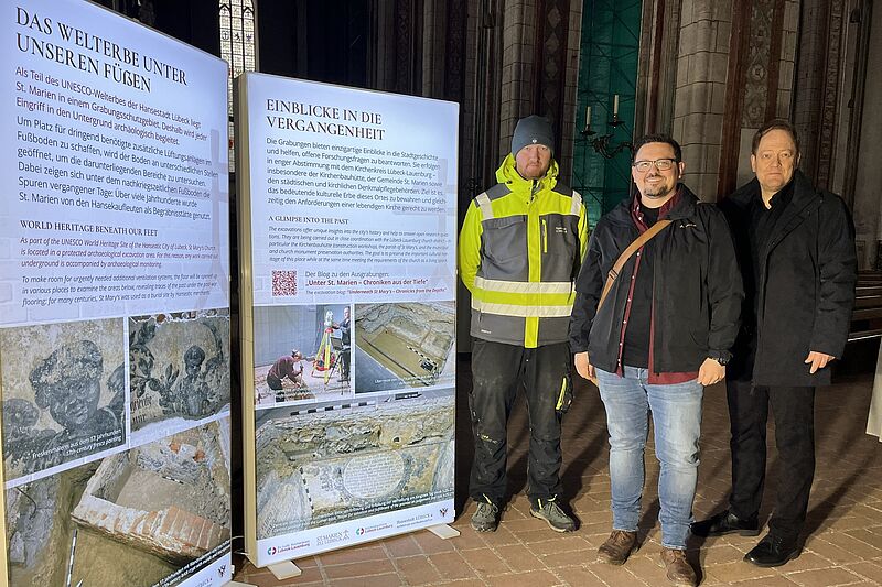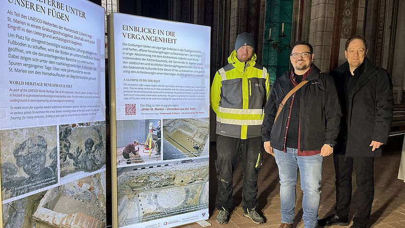 Faszinierende Einblicke in das historische Welterbe Lübeck liefern zurzeit archäologische Untersuchungen unter dem Fußboden von St. Marien in Lübeck. Im Fokus stehen dabei die historischen Grüfte und deren Bedeutung als Bestattungsorte der Hanse-Eliten. Ganz neu: Über beleuchtete Infotafeln erfahren Besucherinnen und Besucher mehr über die Arbeiten der Archäologen.
