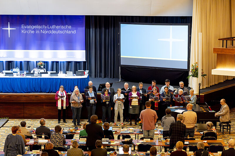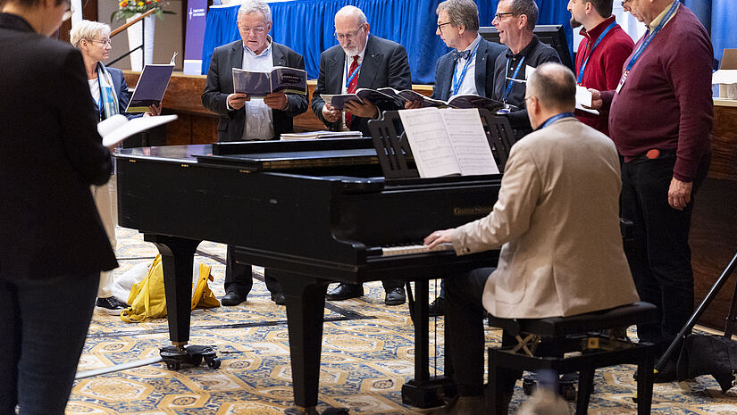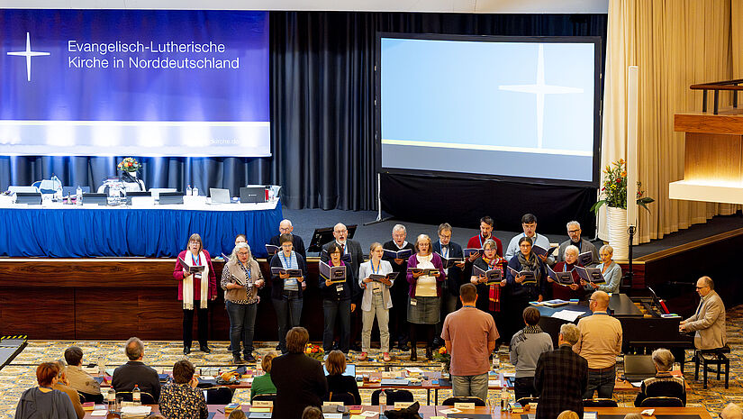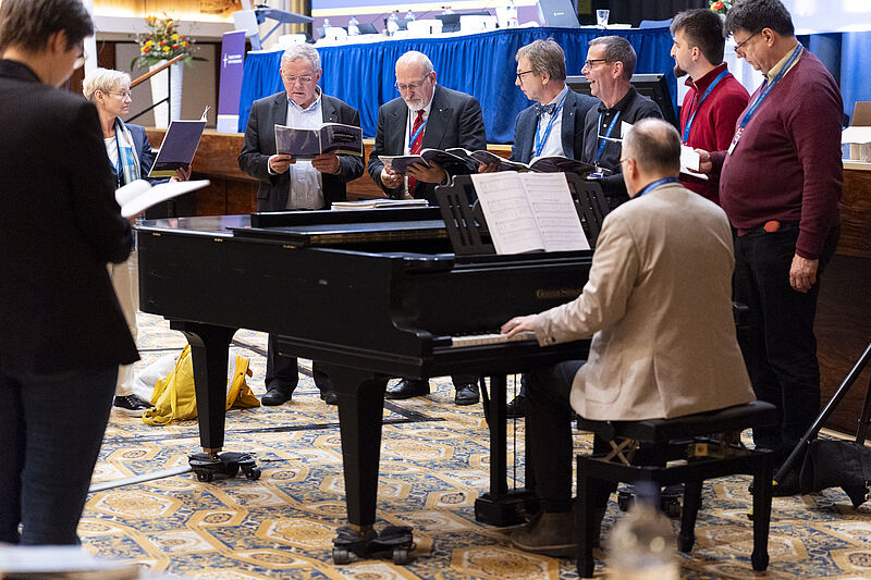 Der dritte Tagungstag startet mit dem Morgensingen. Der Synodenchor singt im Wechsel mit den Synodalen "Mein Herz, oh Gott, ist dir bereit" von Heinrich Schütz.