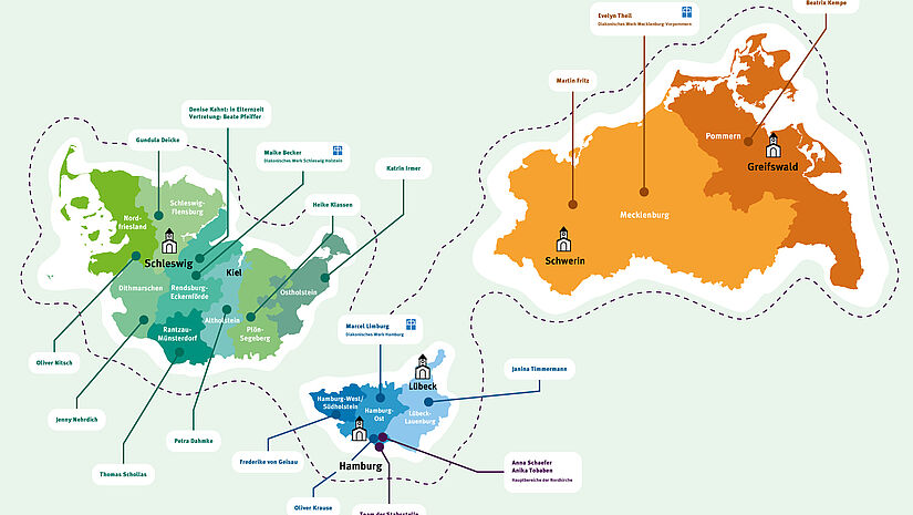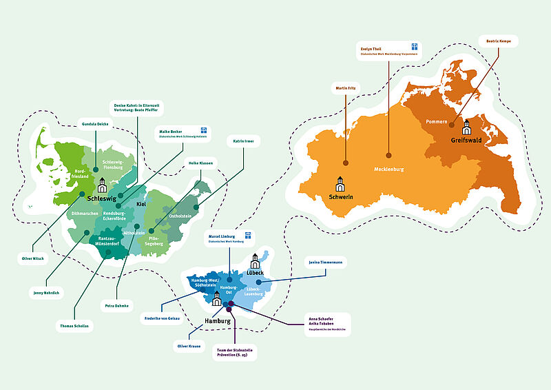 In allen 13 Kirchenkreisen, in den drei Diakonischen Werken und für die Hauptbereiche der Nordkirche gibt es sowohl Präventionsbeauftragte wie auch Meldebeauftragte.