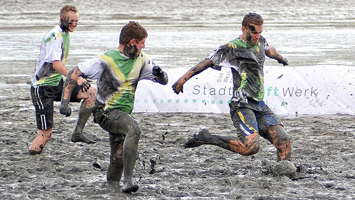 Zum neunten Mal tragen matsch-begeisterte Teilnehmer am Elbdeich Soesmenhusen bei Brunsbüttel Wettkämpfe in Disziplinen wie Wattfußball, Schlickschlittenrennen, Wolliball und Aalstaffellauf aus.