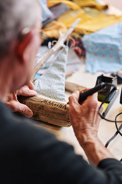 Die Workshops finden viermal im Jahr statt. Wir treffen uns in unserer großen Werkstatt, die mit schönen, natürlichen Materialien ausgestattet ist: Holz, Treibholz vom Bodensee, alte Nägel, Stoffe, Masten und sogar ein Gravurgerät. Das Treibholz bekommen wir von jemandem, der es extra für uns sammelt, damit es auch schwimmfähig und optisch passend ist.