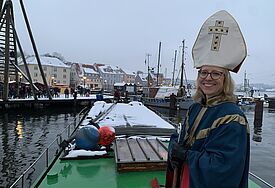 Bischöfin Nora Steen kommt im Gewand des Nikolaus per Schiff nach Flensburg