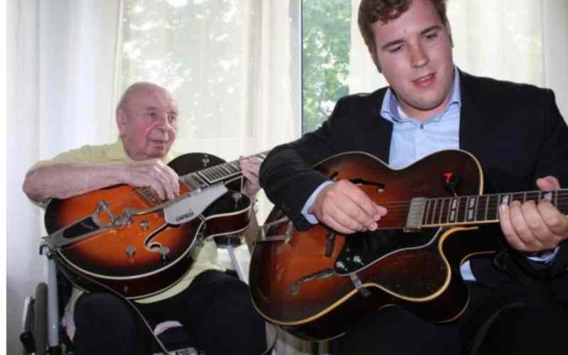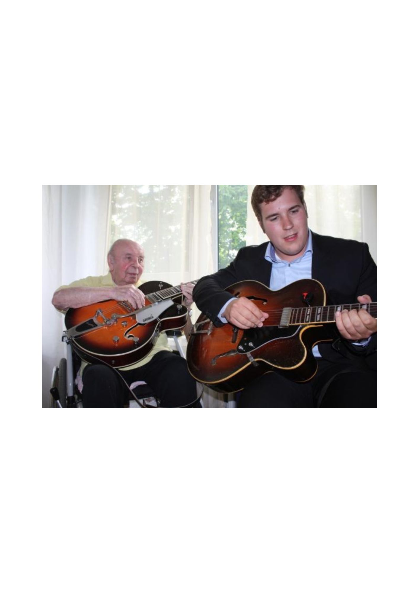 Coco Schumann (1924-2018) war als Jude Überlebender des Holocaust und bis zu seinem Tod als Zeitzeuge aktiv. Er spielte bei den "Ghetto Swingers" im KZ Theresienstadt und wirkte mit ihnen 1944 am NS Propaganda Film "Ein Dokumentarfilm aus dem jüdischen Siedlungsgebiet" mit. Es folgten Deportationen nach Auschwitz und Dachau. Auch hier war Coco als Musiker aktiv. 1945 wurde er auf einem Todesmarsch befreit.