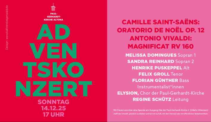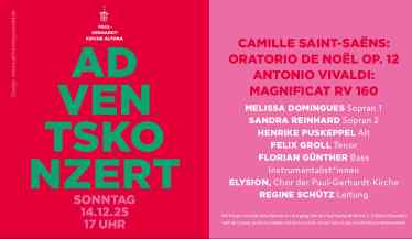 Herzliche Einladung zum diesjährigen Adventskonzert mit Chor- und Orchestermusik aus Frankreich und Italien! Der französische Komponist Camille Saint-Saëns war Organist an der Kirche St. Madeleine in Paris und hatte schon 3 Sinfonien komponiert, ehe er mit 24 Jahren sein Weihnachtsoratorium, das „Oratorio de Noël“ schrieb. Akteure sind neben Elysion, dem Chor der Paul-Gerhardt-Kirche und Gesangssolist*innen ein Orchester aus Streichern, Orgel und Harfe.