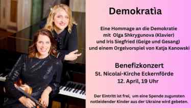 Am 12. April präsentieren in der Eckernförder St. Nicolai-Kirche die ehemaligen Mitglieder des bekannten Ensembles „Salut Salon“, Olga Shkrygunova (Klavier) und Iris Siegfried (Violine und Gesang) ihr bewegendes Konzert „Demokratià“.