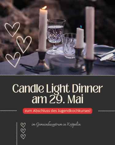 Ab 18:00 Uhr beginnt unser gemütliches Candle-Light-Dinner mit einem Vier-Gänge-Menü (Einlass ab 17:45 Uhr). Das Vier-Gänge-Menü beinhaltet eine kalte Vorspeise, eine Suppe, einen Hauptgang und einen Nachtisch. Nach dem Essen geht es für die weiter die tanzen möchten. Eine leckere Cocktail- und Getränkeauswahl darf dabei natürlich nicht fehlen. Die Playlist ist sorgfältig und geschmackvoll für Jung und Alt ausgewählt. Tanzen, Wippen oder einfach den Abend genießen – eine herzliche Einladung von unseren Jugendlichen!