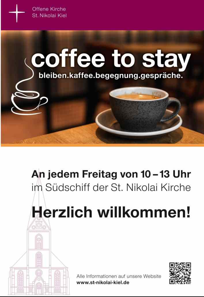 Hier gibt es Kaffee, Tee, Gebäck und halbe Brötchen mit Frischkäse nur zum Hier-Genießen - alles gratis (heißt: Wer kann, gibt etwas in die Spendendose, wer gerade nichts übrig hat, ist herzlich eingeladen. Gebäck und Brötchen spendet die Bäckerei Brotgarten - dafür herzlichen Dank!) und dazu Begegnungen und Gespräche mit Menschen von überall her: von der Straße und vom Kreuzfahrtschiff, vom Einkaufsbummel und von der Unterkunft für Menschen ohne Wohnung. Manche suchen Gesellschaft, andere Ruhe, die einen genießen die Kühle der Kirche und andere die Wärme des Kaffees und die Atmosphäre. Die einen holen einen Gutschein für ein warmes Mittagessen ab, die anderen wollen Kiel kennenlernen, einige möchten Musik hören und andere haben Lust, Musik zu machen.