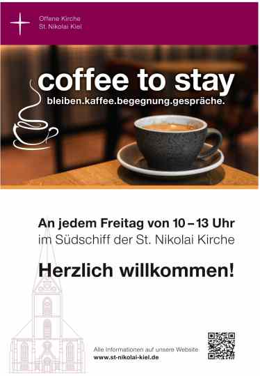 Hier gibt es Kaffee, Tee, Gebäck und halbe Brötchen mit Frischkäse nur zum Hier-Genießen - alles gratis (heißt: Wer kann, gibt etwas in die Spendendose, wer gerade nichts übrig hat, ist herzlich eingeladen. Gebäck und Brötchen spendet die Bäckerei Brotgarten - dafür herzlichen Dank!) und dazu Begegnungen und Gespräche mit Menschen von überall her: von der Straße und vom Kreuzfahrtschiff, vom Einkaufsbummel und von der Unterkunft für Menschen ohne Wohnung. Manche suchen Gesellschaft, andere Ruhe, die einen genießen die Kühle der Kirche und andere die Wärme des Kaffees und die Atmosphäre. Die einen holen einen Gutschein für ein warmes Mittagessen ab, die anderen wollen Kiel kennenlernen, einige möchten Musik hören und andere haben Lust, Musik zu machen.