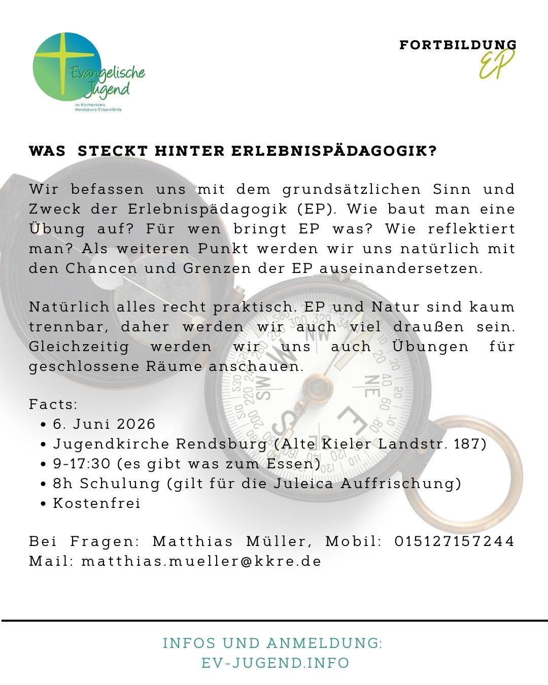 Facts: 6. Juni 2026 | Jugendkirche Rendsburg (Alte Kieler Landstr. 187) | 9-17:30 (es gibt was zum Essen) | 8h Schulung (gilt für die Juleica Auffrischung) | Kostenfrei