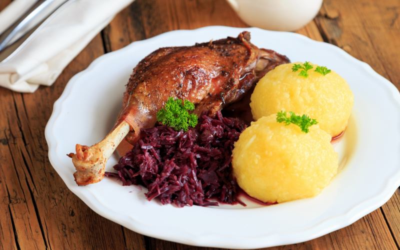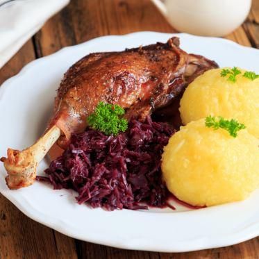 Es gibt Ente mit Kartoffelklößen, Rotkohl und Soße. Zum Nachtisch gibt es Mousse au Chocolat.