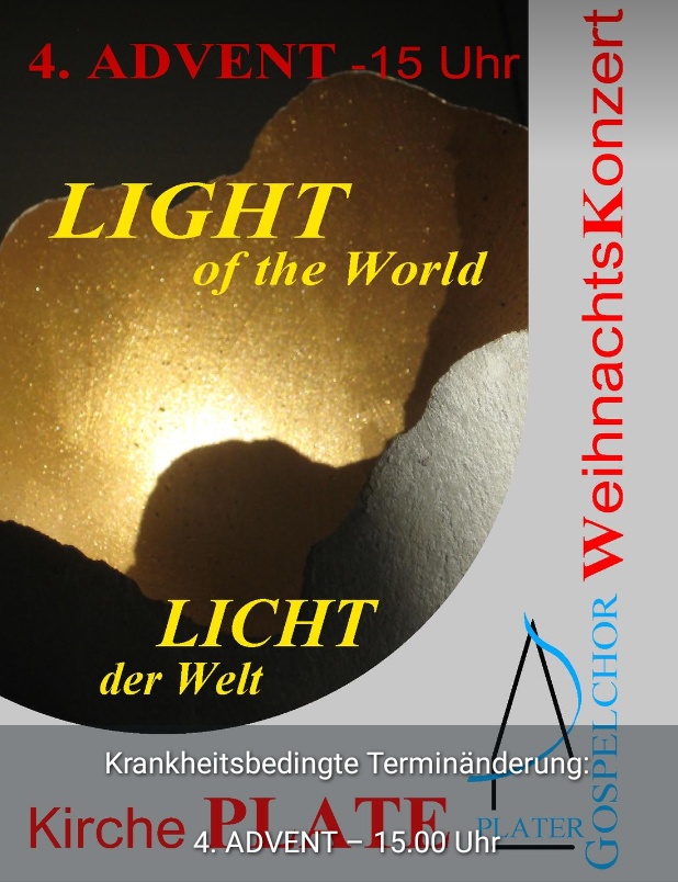 Am Sonntag, 21. Dezember 2025 um 15.00 Uhr singt der „Plater Gospelchor“ unter der Leitung von Dr. Kuhrt (Gitarre, Keyboard und Gesang)
