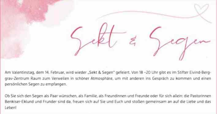 Am Valentinstag, dem 14. Februar, wird wieder „Sekt & Segen“ gefeiert. Von 18 –20 Uhr gibt es im Stifter Eivind-Berggrav-Zentrum Raum zum Verweilen in schöner Atmosphäre, um mit anderen ins Gespräch zu kommen und einen persönlichen Segen zu empfangen.