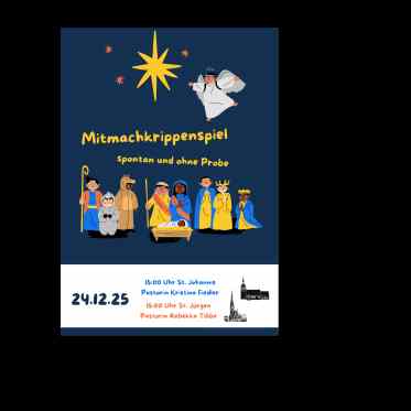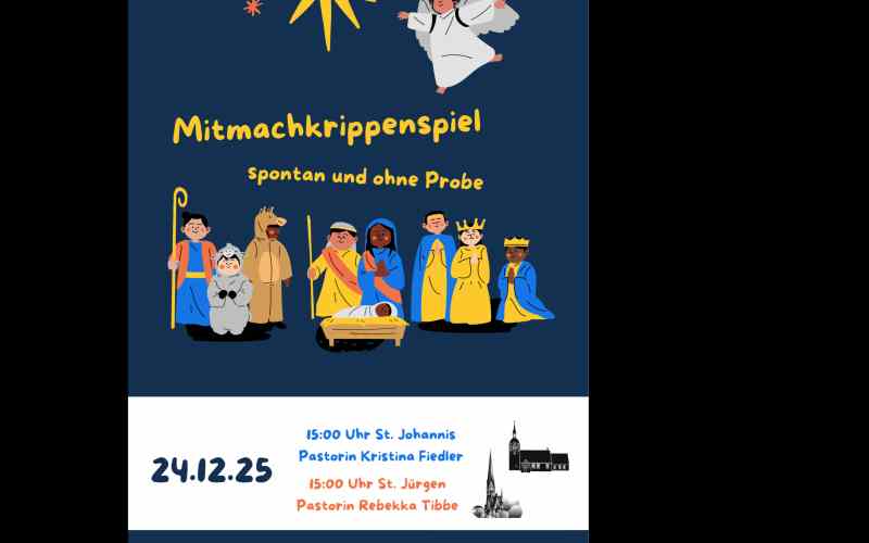 Auch in diesem Jahr gibt es die Neuauflage des ganz besonderen Krippenspiels. Was ist das Besondere daran? Es gibt vorher keine Proben! Wir spielen das Krippenspiel zusammen mit denen, die da sind. So spontan und improvisiert wie eine Geburt im Stall bei Ochs und Esel und so wunderbar wie die Ankunft von Jesus, dem Sohn Gottes, auf Erden soll es werden. Ihr müsst nichts auswendig lernen oder mitbringen außer euch selbst und am besten noch ein paar Verwandte oder Freund:innen. Wir freuen uns darauf, es mit euch Weihnachten werden zu lassen!
