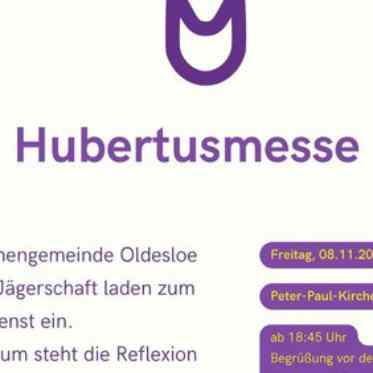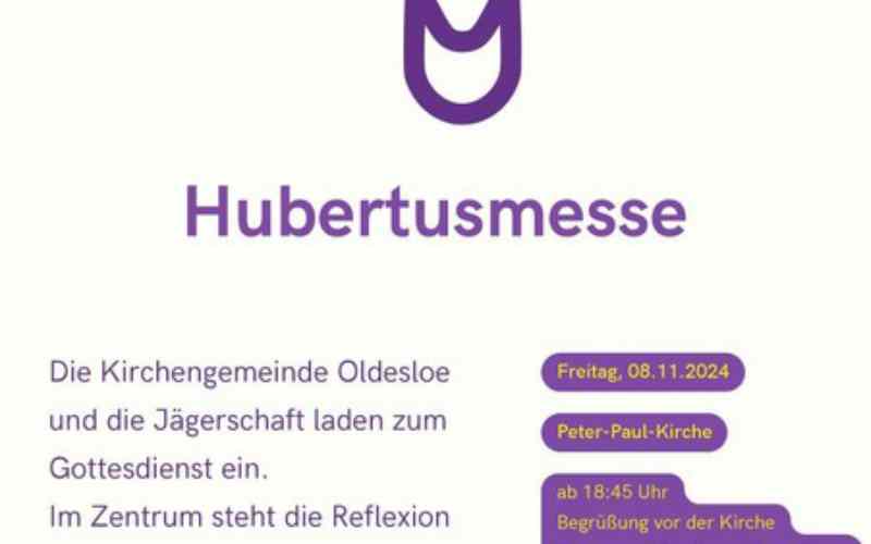 Bad Oldesloe. Zur traditionelle Hubertusmesse am Freitag, 8. November, um 19 Uhr in der Peter-Paul-Kirche lädt das bestehende Vorbereitungs-Team unter Mitwirkung von Pastor Felix Grimbo herzlich ein. Zur musikalischen Begrüßung ist vor der Kirche das Stormarner Bläser-Corps zu hören. Die musikalische Gestaltung im Inneren der Kirche übernehmen die Naturhornbläser Woldenhorn und Organist Marcus Rau.
