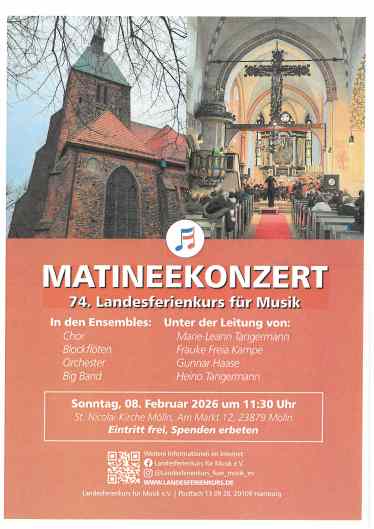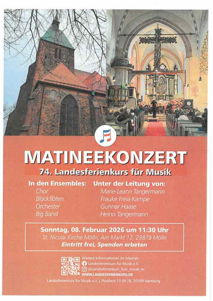 Konzertbeginn ist am 08. Februar um 11:30 Uhr in der St. Nicolai-Kirche, Am Markt 12, 23879 Mölln. Der Eintritt ist frei, um Spenden für den Trägerverein des Kurses wird gebeten. Die jungen Musiker:innen freuen sich auf ein zahlreiches Publikum!