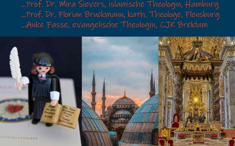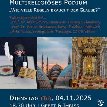 Zu dieser vielseitigen Frage diskutieren am 04. November um 19.15 Uhr Prof. Dr. Florian Bruckmann (Kath. Theologe, EUF), Prof. Dr. Mira Sievers (Islamische Theologin, Uni Hamburg) und Anke Fasse (Ev. Theologin, Leiterin Christian-Jensen-Kolleg Breklum) in der Campelle Flensburg: