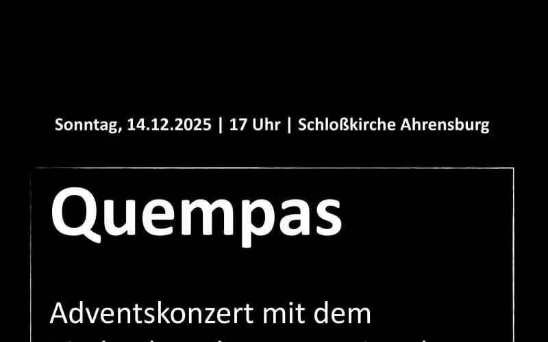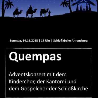 Am 3. Advent, dem 14. Dezember findet um 17 Uhr in der Schloßkirche zum dritten Mal ein Adventskonzert mit allen Chören der Schloßkirche statt. Im Mittelpunkt wird der „Quempas“, eine frühneuzeitliche Zusammenstellung von drei lateinischen Weihnachtsliedern, stehen. Neben Advents- und Weihnachtsliedern erklingen auch ein- und mehrstimmige Kompositionen von unserem Kinderchor, dem Gospelchor und der Kantorei.