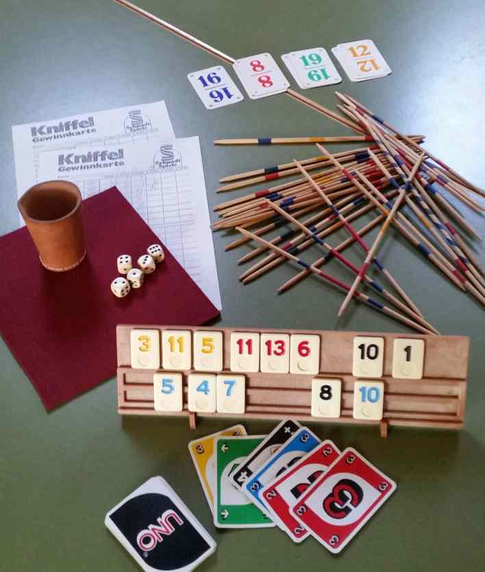 Es ist ein Fundus an Würfel-, Karten-, Brett- und Gesellschaftsspielen vorhanden. Es können gern selbst Spiele mitgebracht werden. Wir spielen z.B. Kniffel und Rummy Kub.