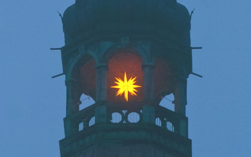 Mit der Erleuchtung des Herrnhuter Sterns in der Turmkuppel am Samstag vor dem 1. Advent laden der Posaunenchor und die Blockflötenkreise der Innenstadtgemeinde ein zum gemeinsamen Singen und Musizieren der schönsten Adventslieder.