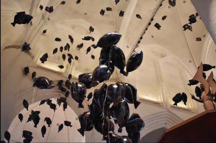 Die Installation spielt mit Perspektivwechseln und irritiert vertraute Sehgewohnheiten, indem sie das vermeintlich Vertraute – Fische als Wesen der Tiefe – über den Köpfen der Besucher*innen erscheinen lässt.