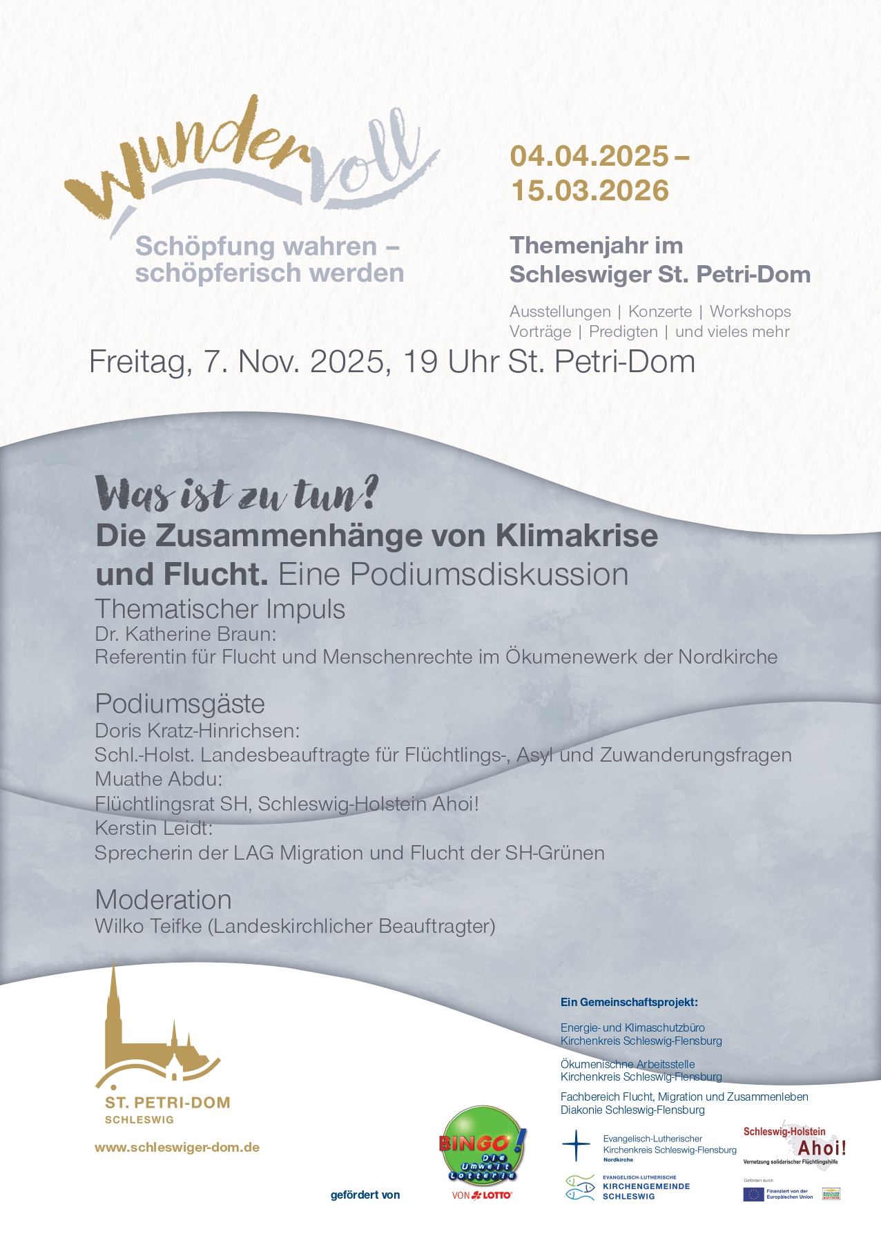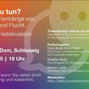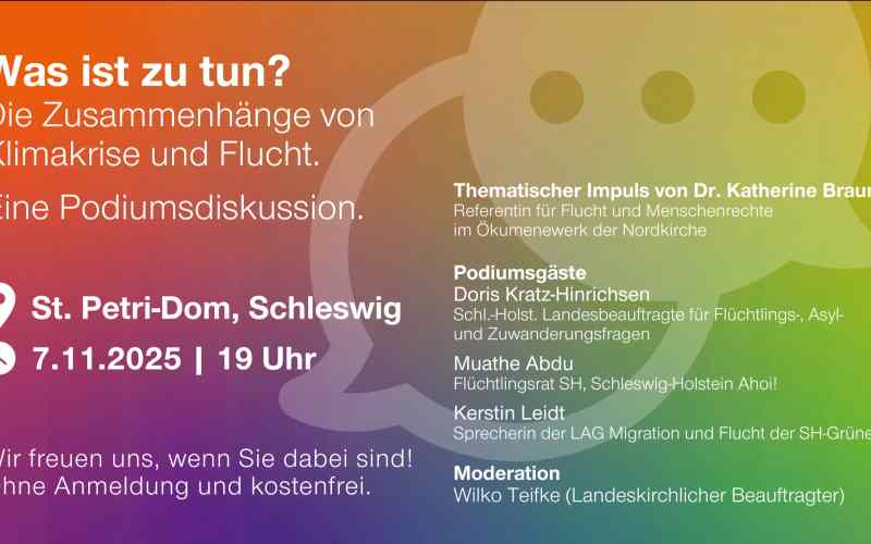 Der Themenabend ist Teil des Rahmenprogramms zur Wanderausstellung KLIMAFLUCHT der Deutschen Klimastiftung, die noch bis zum 28.11. im Schleswiger Dom gezeigt wird. Veranstalter sind der Kirchenkreis Schleswig-Flensburg, die Kirchengemeinde Schleswig und Schleswig-Holstein Ahoi!-Vernetzung solidarischer Flüchtlingshilfe.