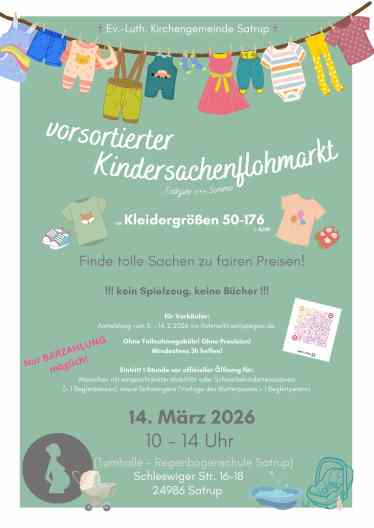 Unser vorsortierter Kindersachenflohmarkt (Größen: 50 – M) für Frühjahr- und Sommerbekleidung findet in der Turnhalle der Regenbogenschule Satrup statt.